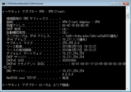 VPN 接続中は、Windows 上に仮想的な LAN カードが作成され、その仮想 LAN カードに「10.211.」で始まるプライベート IP アドレスが割当てられます。また、デフォルトゲートウェイが仮想 LAN カードに設定されます。このことを確認するためには、Windows のコマンドプロンプトから「ipconfig /all」コマンドを実行してみてください。